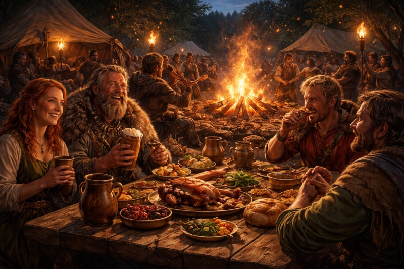 On y mangeait beaucoup de viande, souvent rôtie à la broche, et les convives partageaient les plats dans une ambiance conviviale… et parfois bruyante !