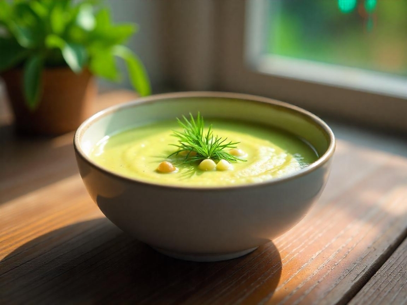 - Mixez et ajustez : Mixez le tout avec un mixeur plongeant jusqu’à obtenir une texture bien lisse. Ajoutez un peu d’eau si c’est trop épais. Salez, poivrez selon vos goûts. Pour plus de douceur, incorporez la crème fraîche juste avant de servir.